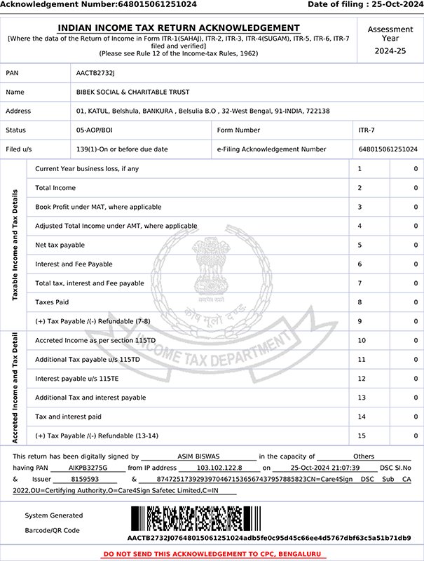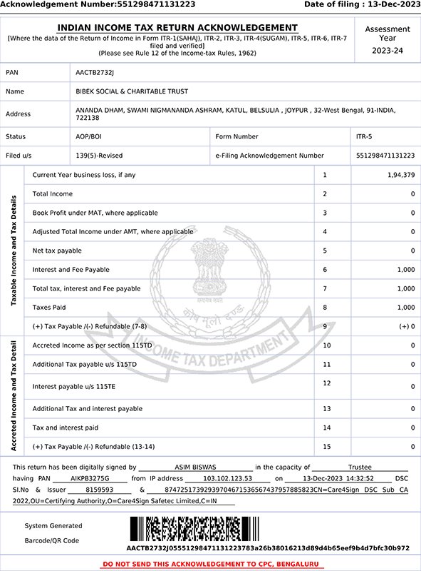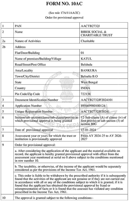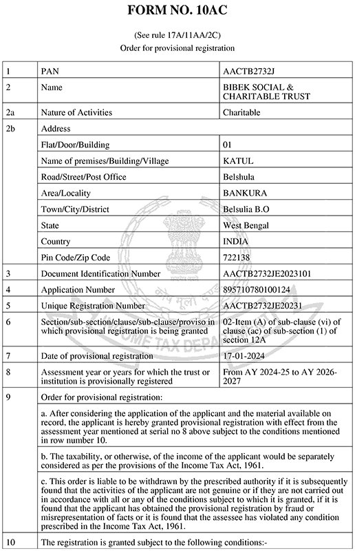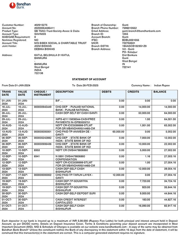 Donation Received A/C Name: Bibek Social & Charitable Trust A/C No: 20200054485411Bank Name: Bandhan BankBranch: GantiIFSC: BDBL0001055