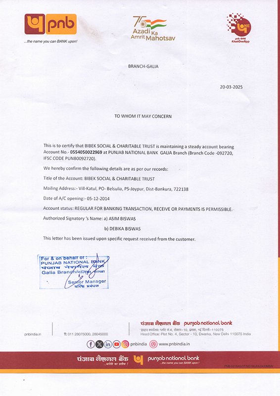 Donation Received A/C Name: Bibek Social & Charitable Trust A/C No: 0554050022969Bank Name: Punjab National BankBranch: GaliaIFSC: PUNB0092720